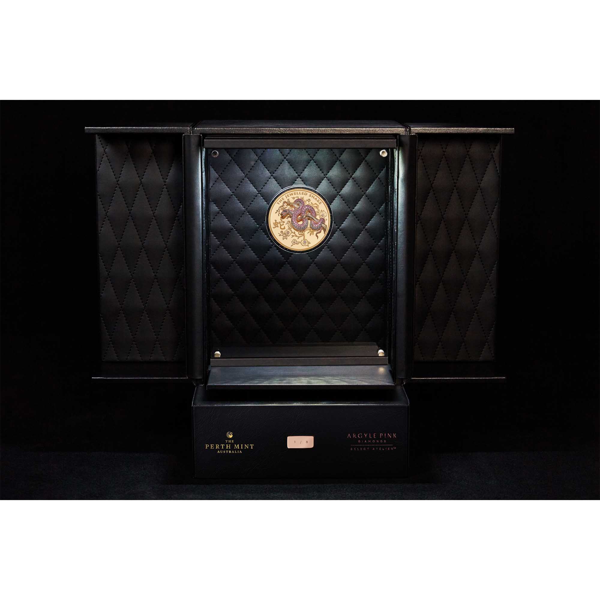 The coin is presented in a luxury display case featuring double-doors embellished with pink gold motifs and two additional Argyle Pink Diamonds™, one on each side. Inside, the illuminated coin continuously rotates through 360 degrees with captivating style. Accompanied by an individually numbered 18-carat rose gold plaque, corresponding to each coins numbered certificate of authenticity, just eight of these stunning objets d'art will be released.