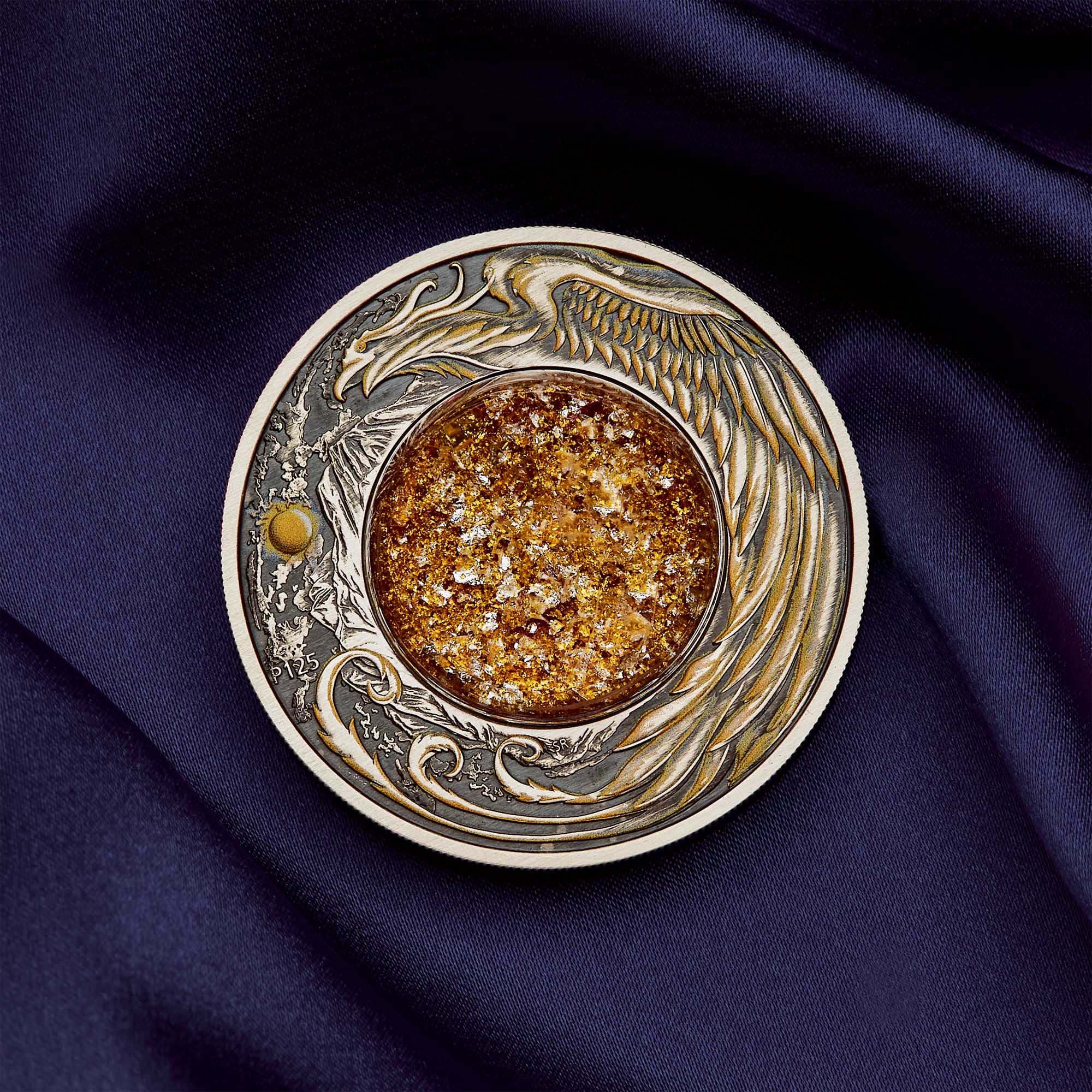 The coin's artistry surrounds a Perspex dome containing authentic gold and silver particles suspended in clear liquid, creating a captivating spectacle of shimmering beauty. The reverse also includes a ‘P125’ mintmark signifying The Perth Mint’s 125th anniversary.