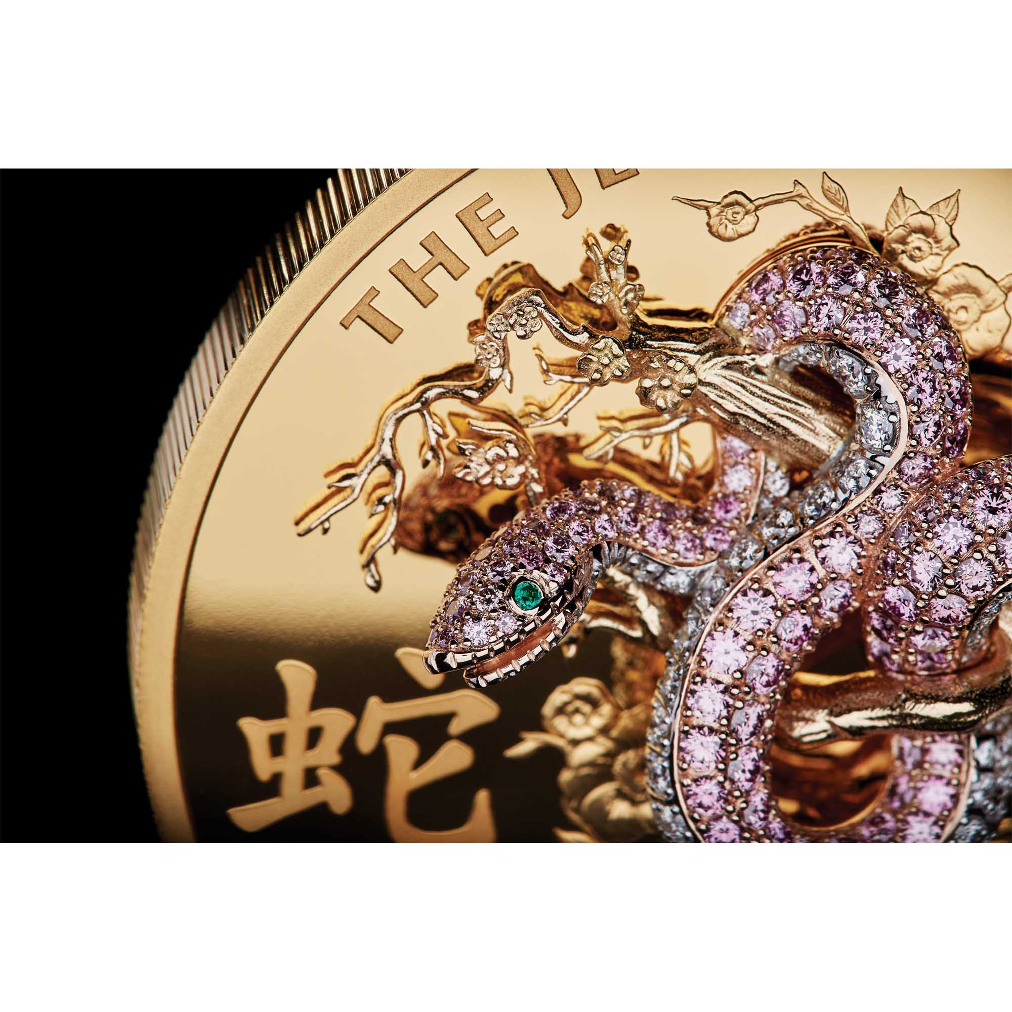 Finished in flawless proof quality, the coin’s artistry includes floral motifs representing plum tree blossom - a noble flower in Asian cultures associated with rebirth and renewal. Additional Argyle Pink Diamonds™ are set at the heart of three flowers. Also included in the design is the inscription ‘THE JEWELLED SNAKE’, the traditional Chinese character for snake, and The Perth Mint’s ‘P’ mintmark.