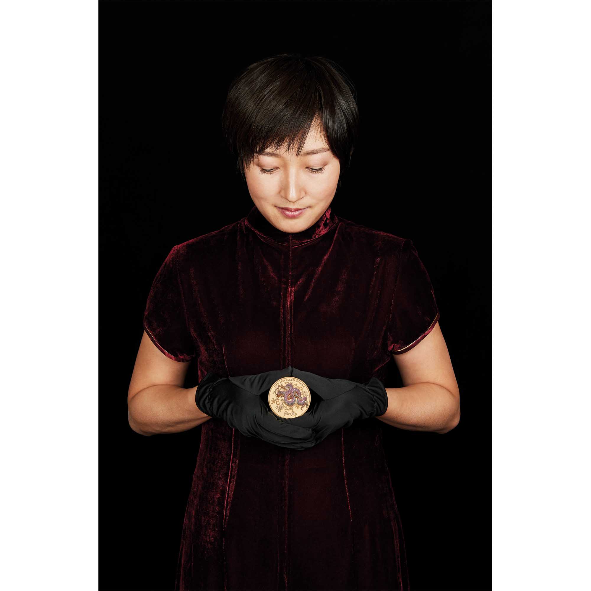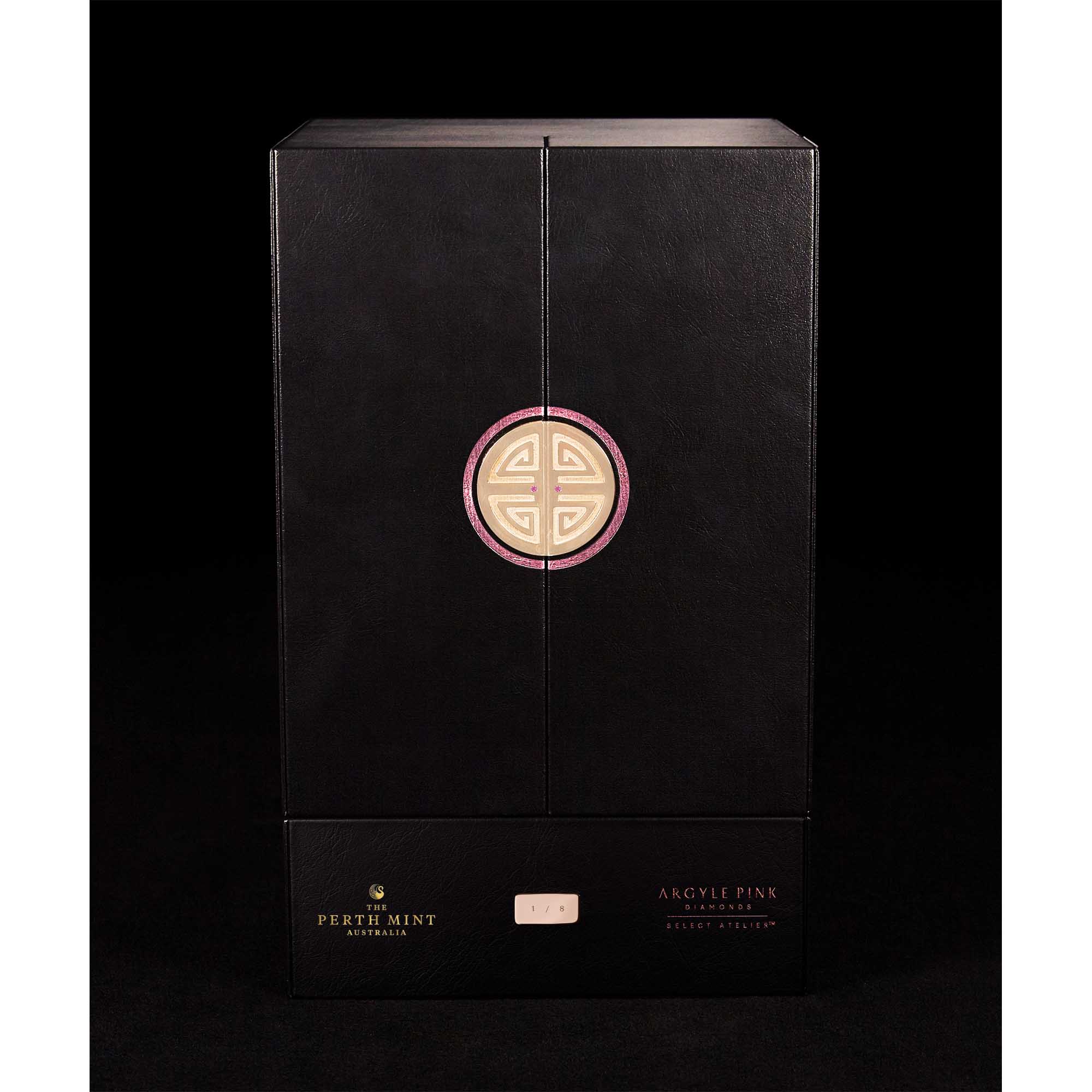 The coin is presented in a luxury display case featuring double-doors embellished with pink gold motifs and two additional Argyle Pink Diamonds™, one on each side. Inside, the illuminated coin continuously rotates through 360 degrees with captivating style. Accompanied by an individually numbered 18-carat rose gold plaque, corresponding to each coins numbered certificate of authenticity, just eight of these stunning objets d'art will be released.