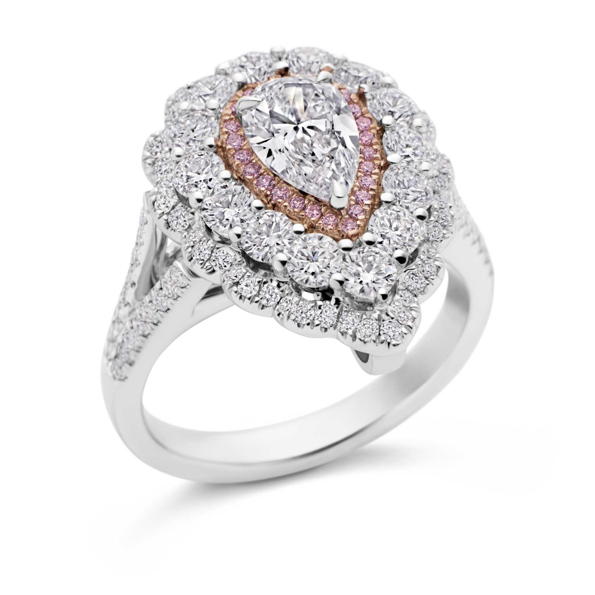The heart of this splendid diamond ring – a 1 carat pear-shaped white diamond – is accentuated by 1.68 carats of brilliant-cut diamonds and 25 pink diamonds in a stunning design statement. The clever design allows the top part of the setting to convert to a pendant.