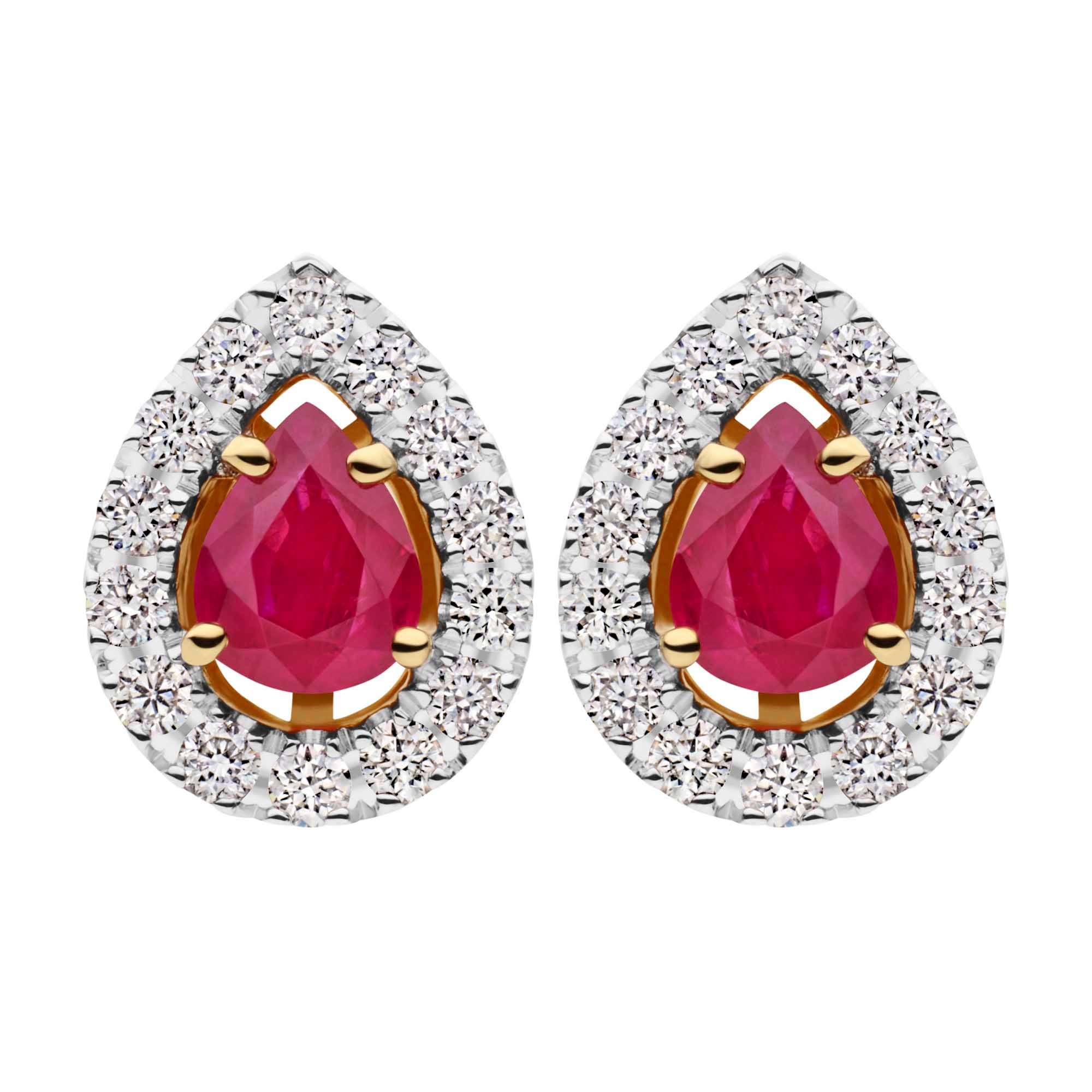 A stunning pear shaped ruby, supported by an expertly crafted yellow gold claw setting, radiates from within a halo of white diamonds.